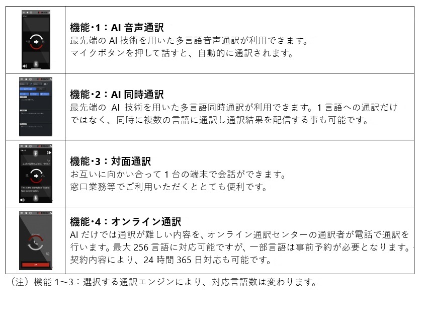 「BRIDGEアプリ」は、最先端の言語処理技術に基づく高度なAI通訳サービスと経験豊富なプロフェッショナル通訳者によるオンライン通訳サービスの両方を組み合わせており、高品質な通訳サービスの利用が可能となっています。